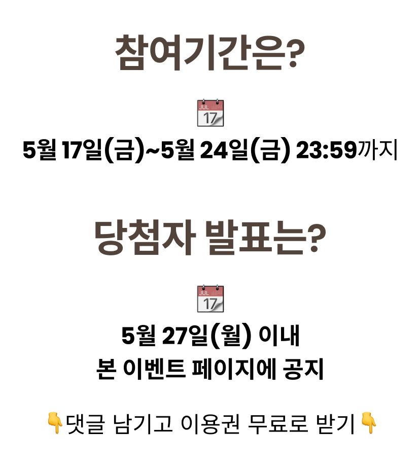 1. 당첨자는 24.5.17(금)~24.5.24(금) 23:59까지 본 게시글 댓글을 남겨주신 분 중 무작위 선정됩니다.