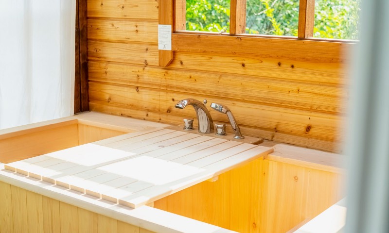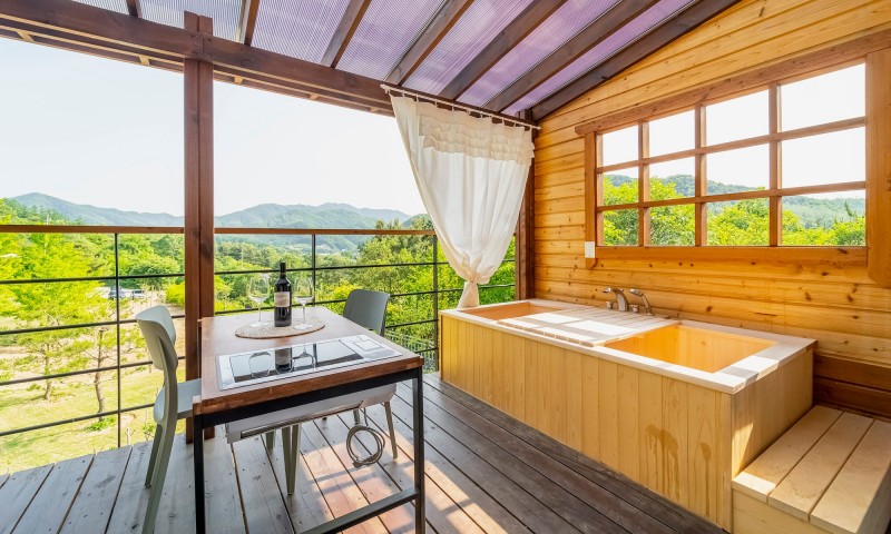 - 특히 독채 객실인 오크동, 체리동 객실에서는 테라스에서 히노끼탕을 이용할 수 있다는 점이 특별해요.