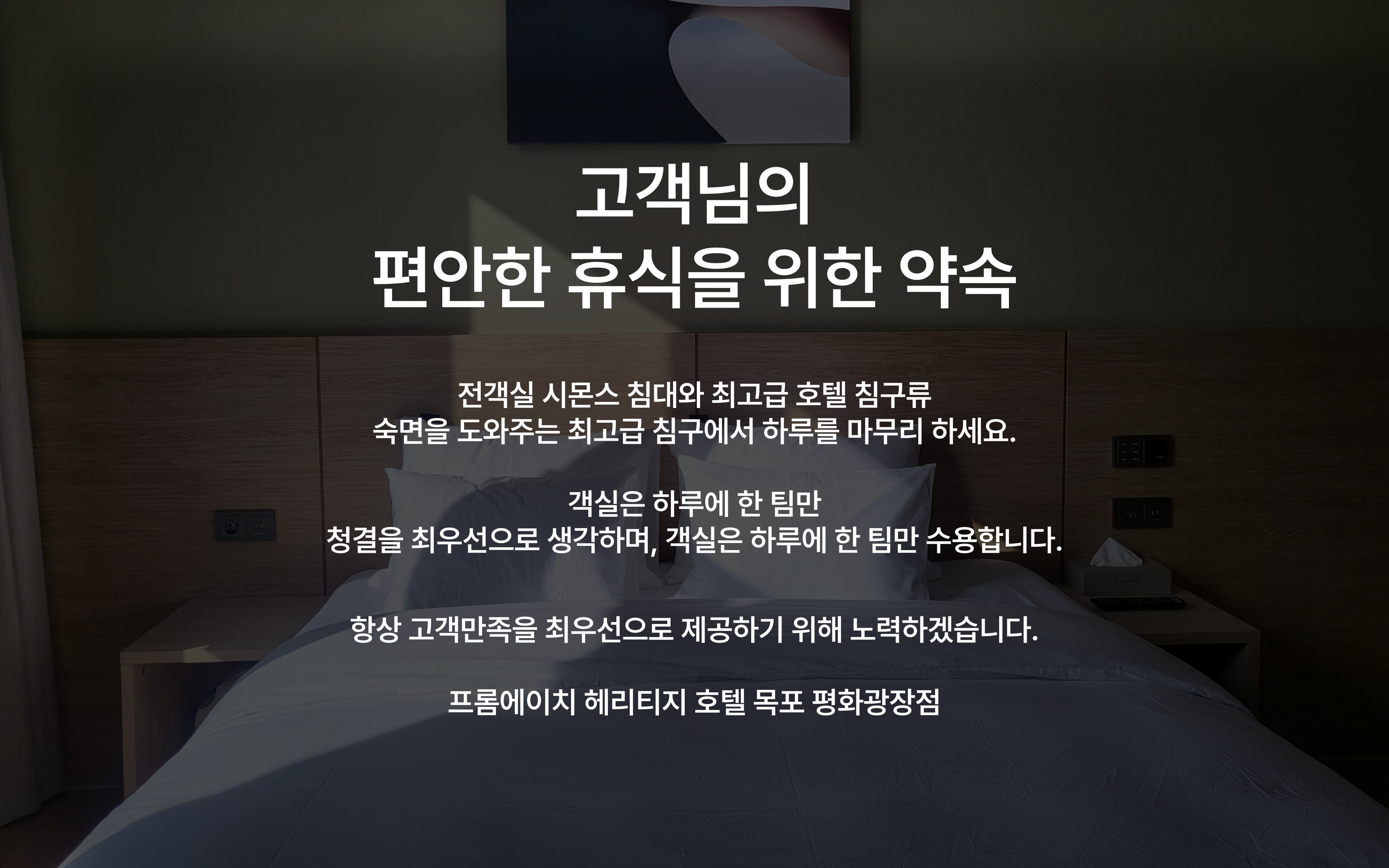 - 프롬.H 헤리티지 호텔은 비즈니스 트립, 연인 또는 친구와의 여행, 홀로 훌쩍 떠나고픈 날에도 늘 편안한 안식처가 될 수 있도록 최상의 서비스를 제공하고자 최선을 다하겠습니다.
