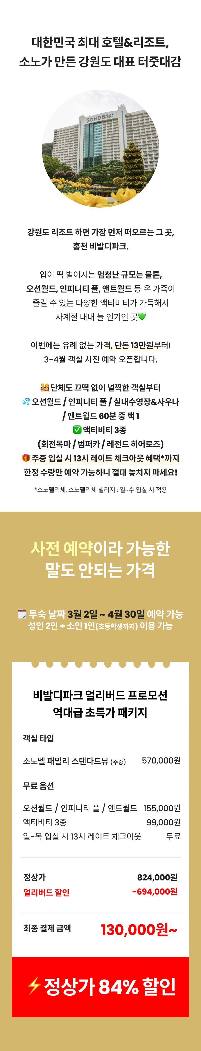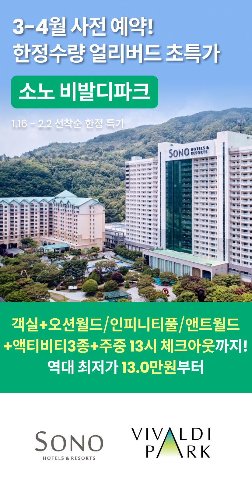 비발디파크 소노캄 얼리버드 패키지(객실+오션3인+할인권)