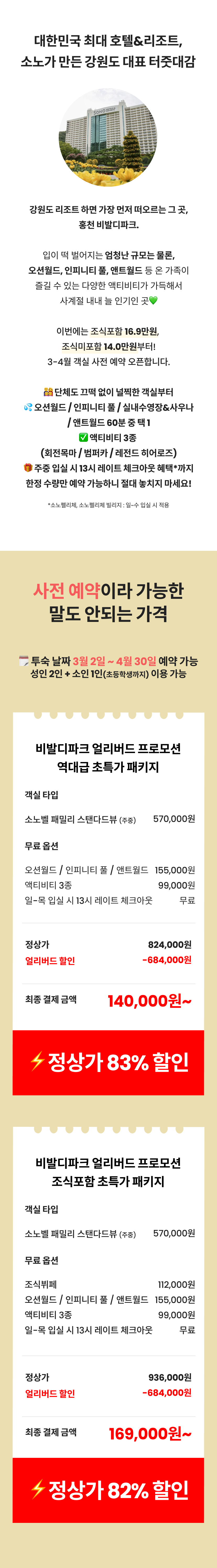 [앵콜] 비발디파크 소노벨 얼리버드 패키지(객실+오션3인+할인권)