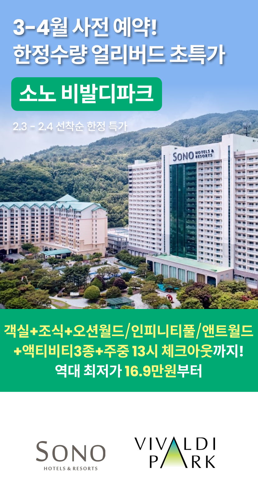 [앵콜] 비발디파크 소노캄 얼리버드 패키지(객실+오션3인+할인권)