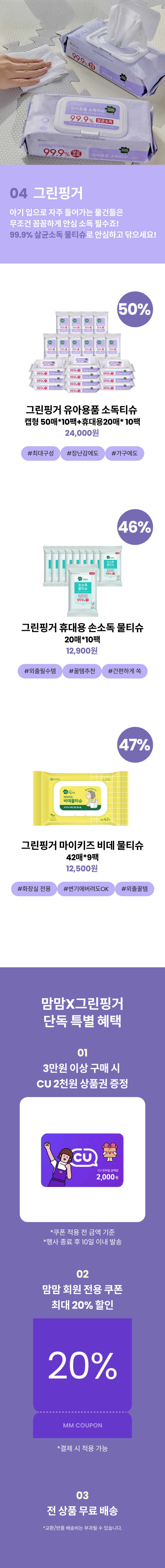 [그린핑거] 유아용품 소독티슈 캡형 50매X10팩+휴대용 20매X10팩+(CU2천원/1회증정)