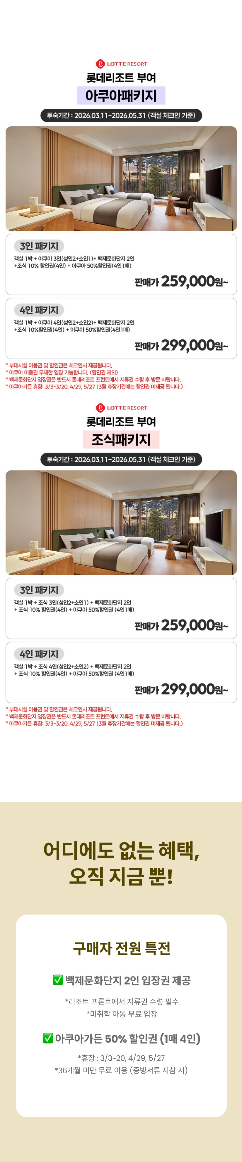 롯데리조트 부여 아쿠아 3/4인 패키지 (객실 1박+아쿠아가든 3/4인+백제문화단지 2인+할인권)