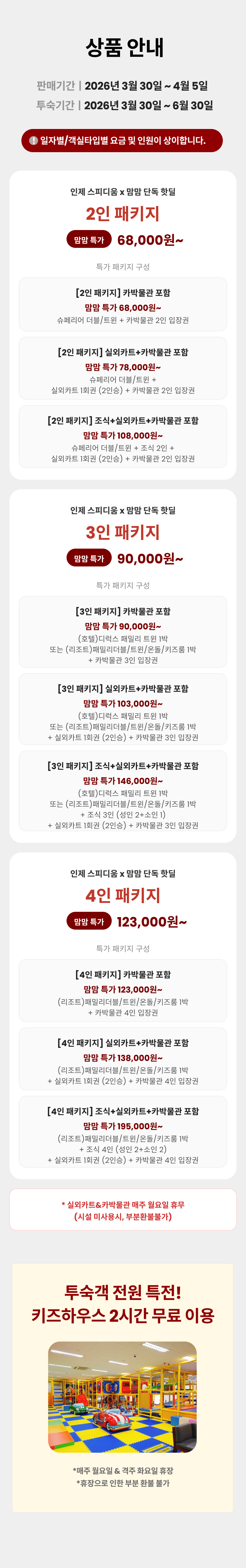 인제스피디움 2/3/4인 패키지 선택인제스피디움맘맘x인제 스피디움 2인 패키지 특가맘맘특가74% 68,000원 무료배송인제스피디움맘맘x인제 스피디움 3인 패키지 특가맘맘특가73% 90,000원 무료배송인제스피디움맘맘x인제 스피디움 4인 패키지 특가맘맘특가70% 123,000원 무료배송