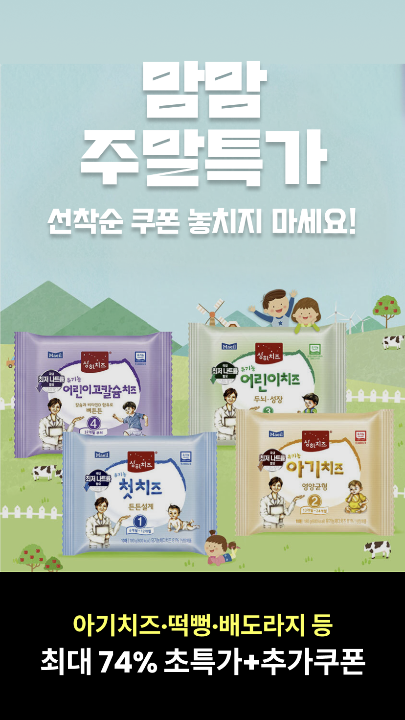 딱! 주말에만 만나볼 수 있는 가격매일유업[매일유업] 상하 유기농 치즈 1단계 첫 치즈/ 2단계 아기치즈 / 3단게 어린이치즈 / 4단계 고칼슘어린이치즈 60매/80매/100매/120매쿠폰할인가32% 23,090원 쿠폰5% 쿠폰 적용됨무료배송또또맘[깜짝특가] 또또맘 개별포장 유기농 떡뻥 쌀떡과자 10박스/20박스 세트쿠폰할인가75% 12,350원 쿠폰5% 쿠폰 적용됨무료배송차일드라이프차일드라이프 액상칼슘마그네슘 473ml 3개입맘맘특가34% 66,400원 루솔[루솔] 진한 배도라지즙 60포쿠폰할인가54% 43,700원 쿠폰5% 쿠폰 적용됨무료배송[만토바] 스프레이 키즈 오일 1+1 특가모음 (택1)쿠폰할인가60% 14,160원 쿠폰5% 쿠폰 적용됨바겐슈타이거[바겐슈타이거] 스텐 메쉬 트레이 2종세트(트레이18cm+채반19cm)쿠폰할인가40% 17,960원 쿠폰5% 쿠폰 적용됨무료배송트렌톤[트렌톤] 다용도보관용기 심플리 1호 8종(750ml x 8개)쿠폰할인가43% 11,310원 쿠폰5% 쿠폰 적용됨무료배송카이야[2+1 총3팩]슈퍼슬림 라이트 기저귀 남여공용(밴드/팬티)/S~XXL쿠폰할인가28% 54,060원 쿠폰5% 쿠폰 적용됨무료배송