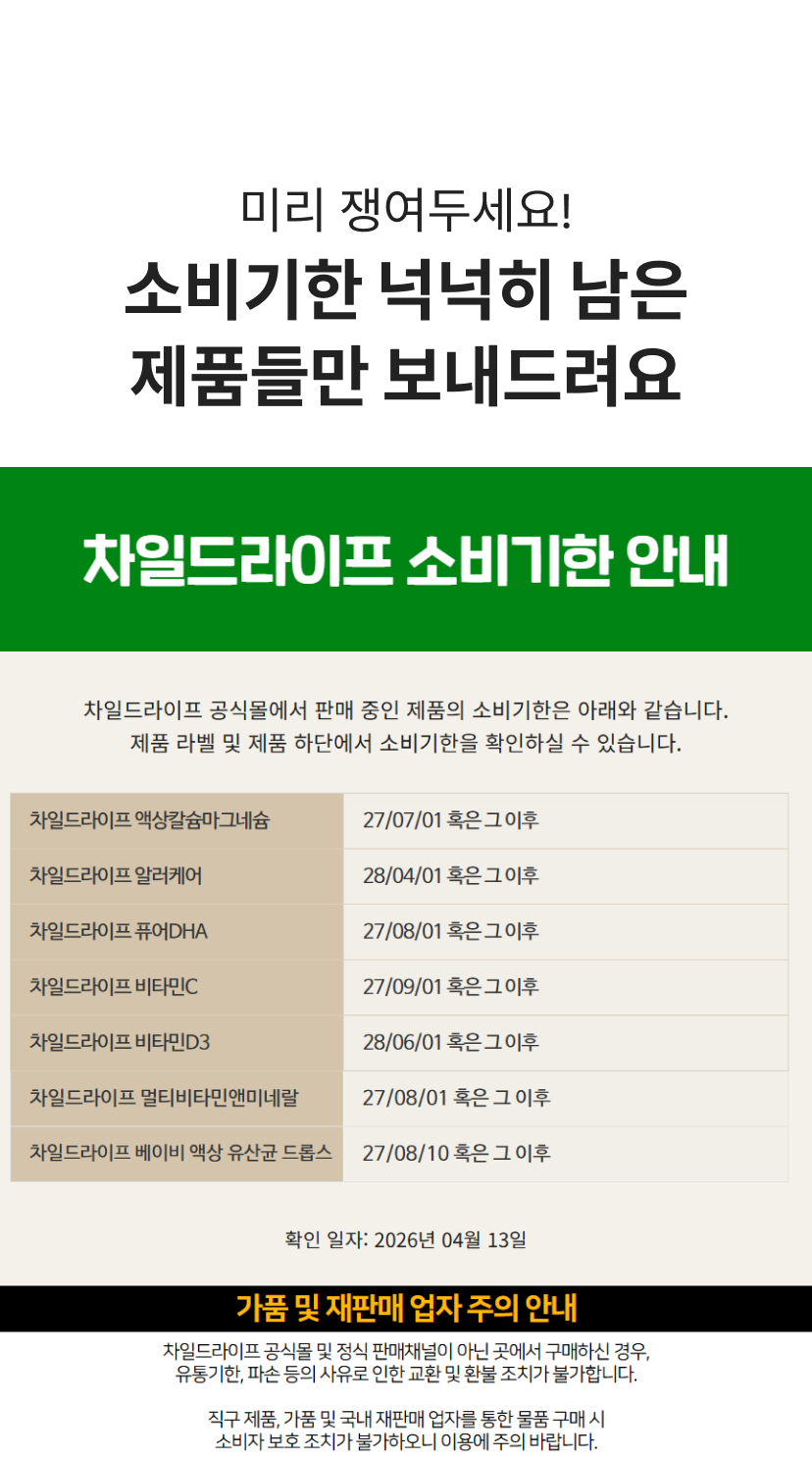 가격인상 전 마지막 특가차일드라이프[차일드라이프] [맘맘 Pick 세트]액상칼마 1병+멀티비타민앤미네랄 1병+알러케어 3병맘맘특가36% 108,000원 차일드라이프[차일드라이프] [데일리 세트] 액상칼마 1병+멀티비타민앤미네랄 2병맘맘특가42% 68,100원 차일드라이프[차일드라이프] 멀티비타민앤미네랄 237ml 2개 세트맘맘특가43% 47,500원 차일드라이프[차일드라이프] 멀티비타민앤미네랄 237ml 4개 세트맘맘특가46% 90,500원 차일드라이프[차일드라이프] 액상칼슘마그네슘 473ml 2개 세트맘맘특가32% 45,500원 차일드라이프[차일드라이프] 액상칼슘마그네슘 473ml 4개 세트맘맘특가37% 84,600원 차일드라이프[차일드라이프] 알러케어 118ml 2개 세트맘맘특가32% 42,300원 차일드라이프[차일드라이프] 알러케어 118ml 4개 세트맘맘특가37% 78,600원 차일드라이프[차일드라이프] 액상 비타민C 118ml 2개 세트맘맘특가44% 17,600원 차일드라이프[차일드라이프] 액상 비타민C 118ml 4개 세트맘맘특가48% 32,700원 차일드라이프[차일드라이프] 퓨어 DHA 90정 2개 세트맘맘특가45% 25,900원 차일드라이프[차일드라이프] 퓨어 DHA 90정 4개 세트맘맘특가49% 48,300원 차일드라이프[차일드라이프] 비타민D3 30ml 2개 세트맘맘특가41% 20,900원 차일드라이프[차일드라이프] 비타민D3 30ml 4개 세트맘맘특가45% 39,100원 차일드라이프[차일드라이프] 베이비 액상 유산균 드롭스 10ml 2개 세트맘맘특가41% 48,900원 차일드라이프[차일드라이프] 베이비 액상 유산균 드롭스 10ml 4개 세트맘맘특가45% 91,900원