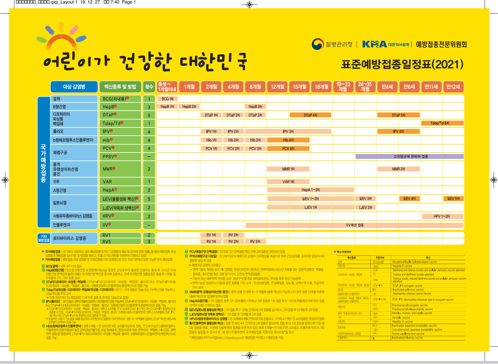 - 필수 접종: BCG(결핵), B형간염, 백일해, 폴리오, b형헤모필루스인플루엔자, 폐렴구균 (무료)